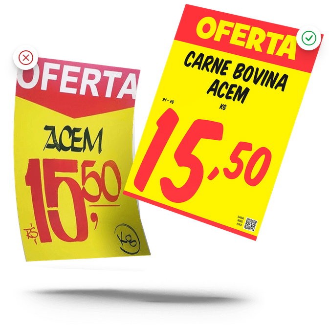Detectamos muita vulnerabilidade na produção de cartazes à mão ou com o auxílio do programa que tínhamos, porque nenhuma das duas opções estavam interligadas ao nosso sistema em tempo real, como acontece atualmente com o Tagsell. Além disso, o Procon faz algumas exigências quanto à conformidade do tamanho dos caracteres de um cartaz, algo que fica impossível de atender quando, por exemplo, a produção é manual ou feita por diferentes colaboradores com o auxílio do Word.